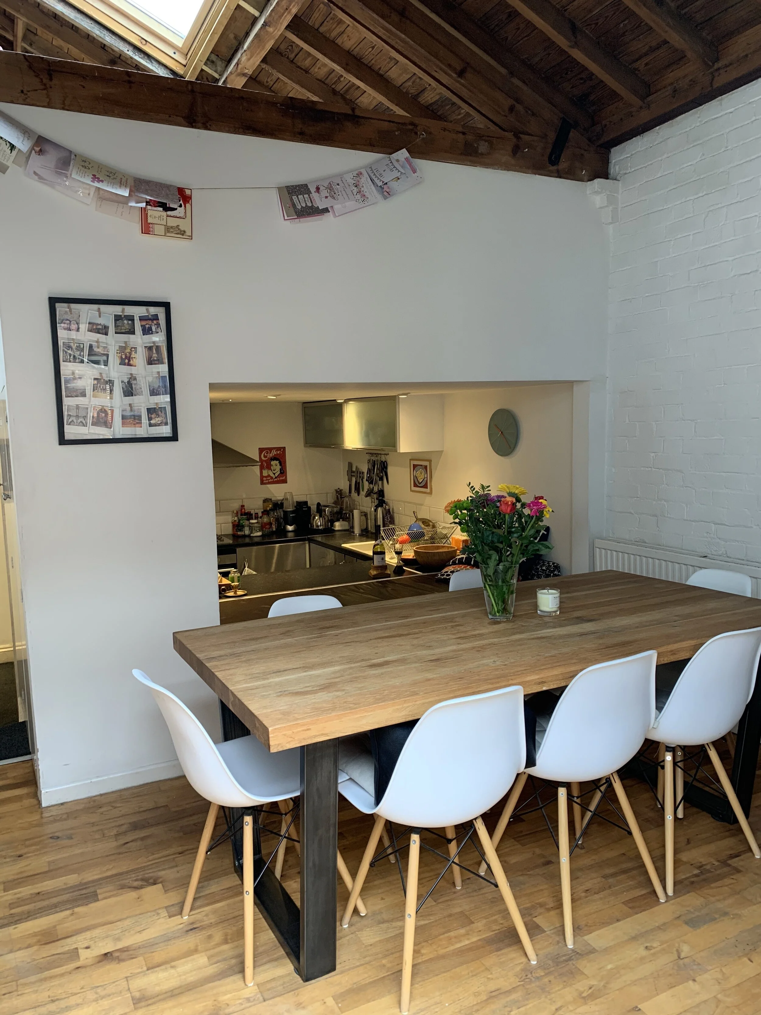 The dining room is double height, into the wooden gabled roof and there is an oak dining table with eight dining chairs. The flooring is oak and the walls painted brick. Large Velux windows flood the space with light.
