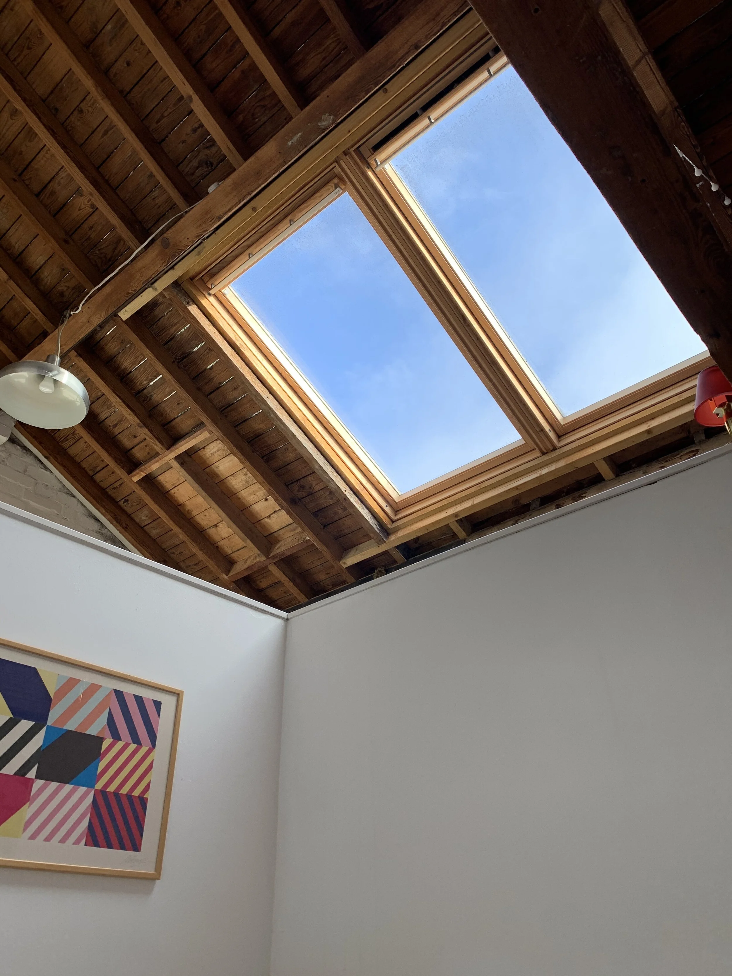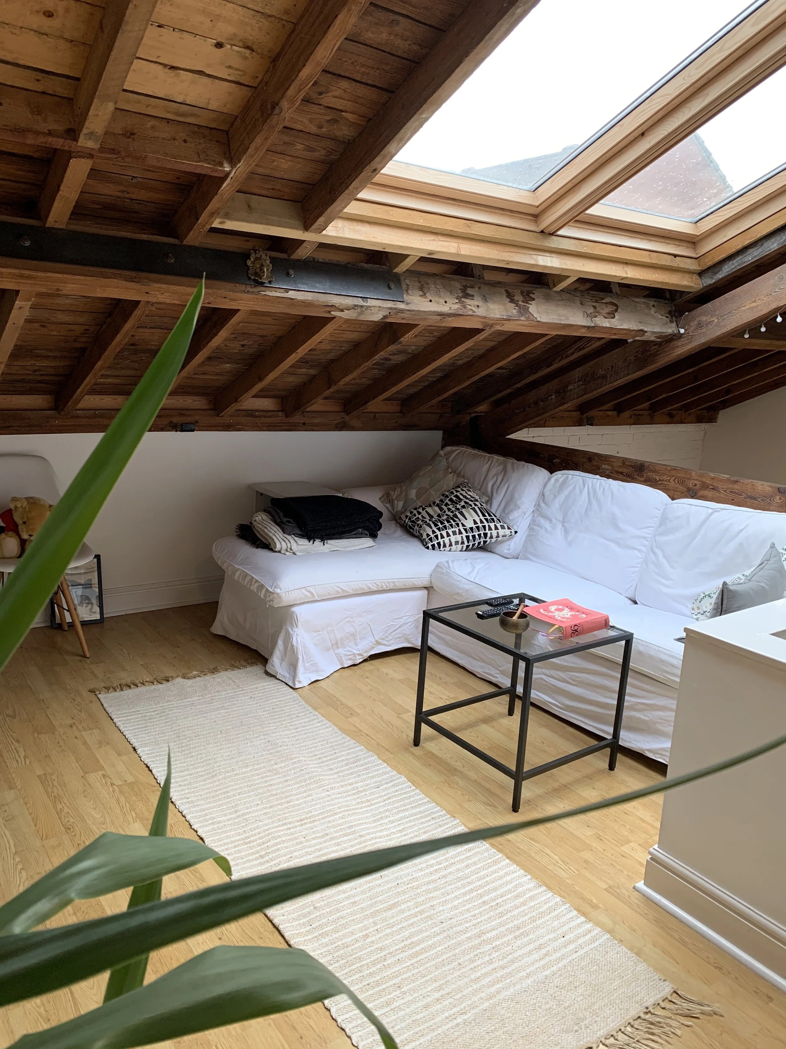 The mezzanine would have been the original hayloft. Although it is up in the eaves, it is spacious, with double Velux windows. The floor is laminate and a ladder of bookshelves offers lots of storage,